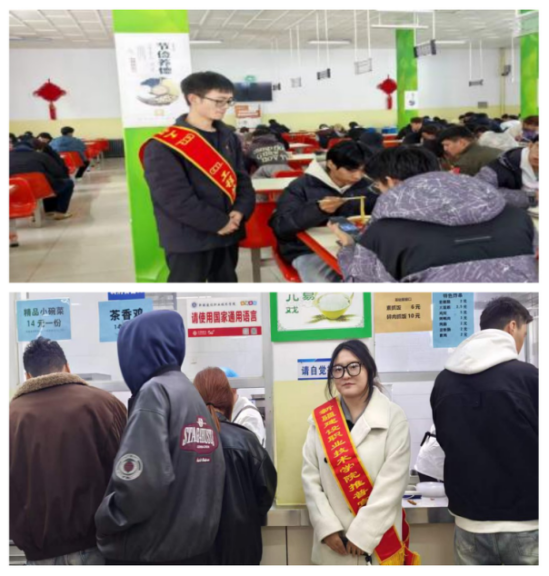 志愿者走进校园食堂,引导有序就餐、倡导光盘行动、开展推普宣传,营造文明就餐氛围。